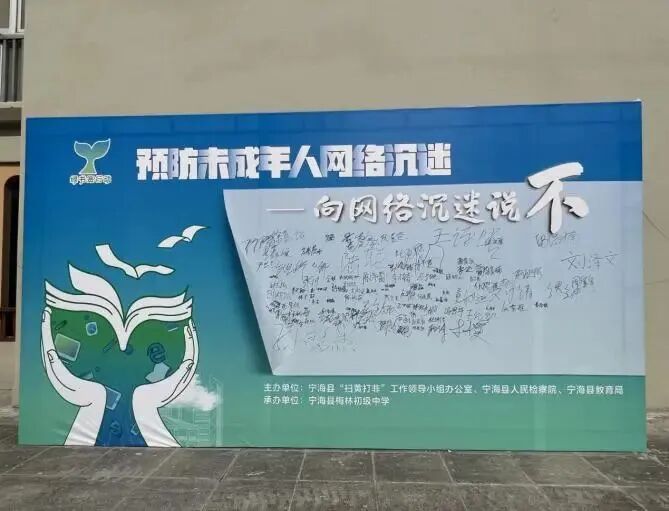 活动中,执法人员以“预防网络沉迷,文明健康上网,保护未成年人健康成长”为主题,从网络沉迷的概念、危害、成因、预防方法以及国家为预防青少年网络沉迷所制定的相关法律规定等方面,结合身边典型事例、执法检查案例进行了讲解,让学生们明白沉迷网络的危害,增强自我辨别能力,合理使用网络,远离沉迷网络游戏等不良行为。活动现场,执法人员向同学们发放了“扫黄打非”以及防网络沉迷宣传折页,同学们郑重地在宣传横幅上签字,表达了自觉遵守《全国青少年网络文明公约》,拒绝沉迷网络、坚持绿色上网的决心。9月28日,由柳州市新闻出版局、“扫黄打非”办公室联合主办的预防未成年人网络沉迷宣传教育活动在柳州市柳南区实验小学智美分校举行。活动以网络防沉迷小课堂、观看网络素养公益视频、有奖知识互动等方式进行。同学们观看了《青少年网络素养公开课》公益短片。短片寓教于乐,引导同学们主动拒绝网络沉迷,做互联网世界的小主人。工作人员围绕沉迷网络的危害、如何预防网络沉迷等问题,向同学们普及了网络安全相关知识,号召大家规范自身行为,自觉抵制网络诱惑,文明上网、科学用网。9月8日,宁波市宁海县“扫黄打非”办公室联合县教育局、检察院等部门开展了未成年人网络防沉迷、网络安全教育进校园活动。