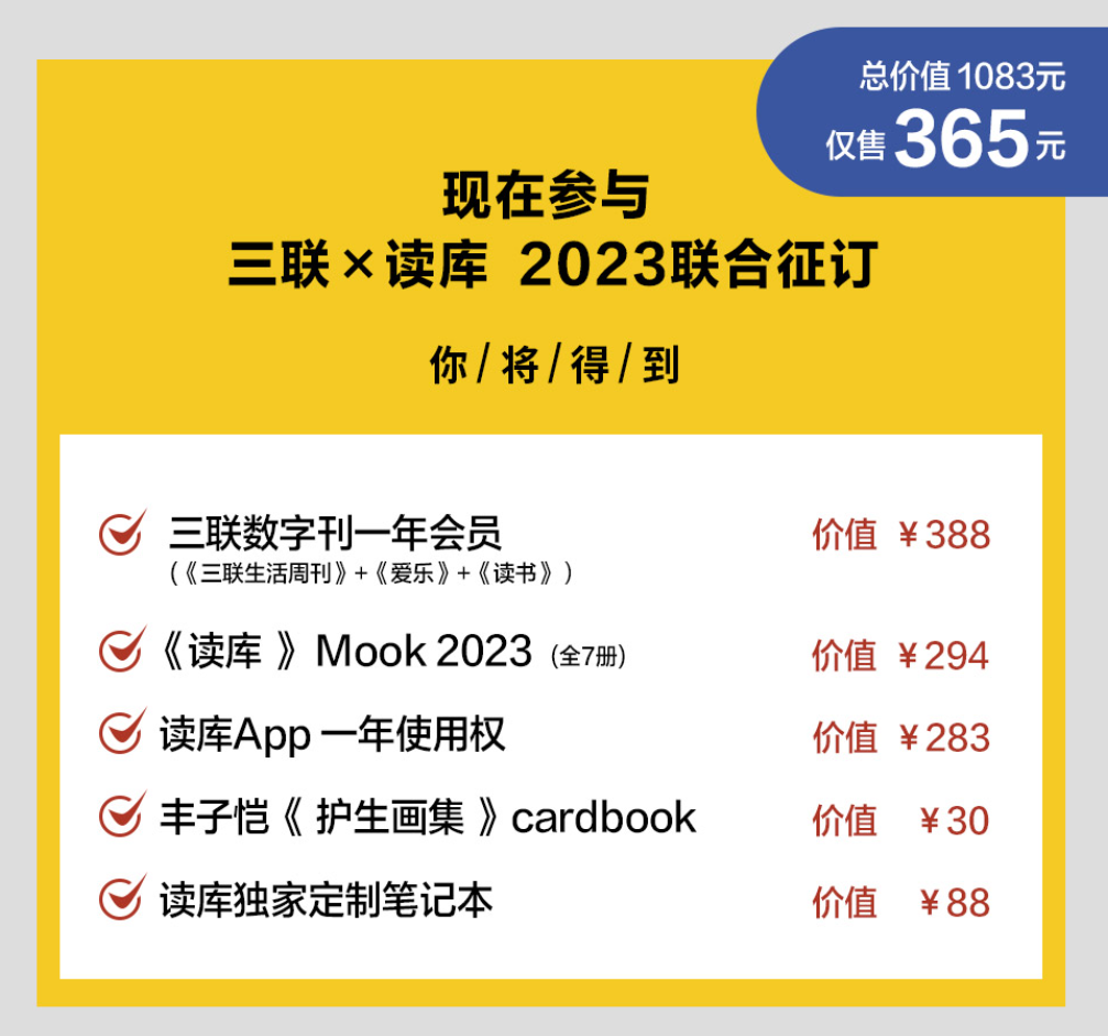 我们携手发起联合征订,为的是给两家读者最低的价格。三联数字刊售价388元/年,《读库》2023全7册售价294元,加上赠品共1083元,这次两家发起限时买一得二,只需365元!每天1元钱,就能让全家人收获全年深度新闻资讯、文化思想洞见、海量小众有料的谈资,谁能不说一句“值”!现在下单的读者,额外加赠丰子恺《护生画集》cardbook和读库独家定制笔记本,感受有情世界,记录随想随笔。你也可以将三联数字刊自己留用,《读库》2023全套送给爱书的朋友(是非常独特、体面的礼物),一份价钱,两种用途,谁能不说一句“妙”!