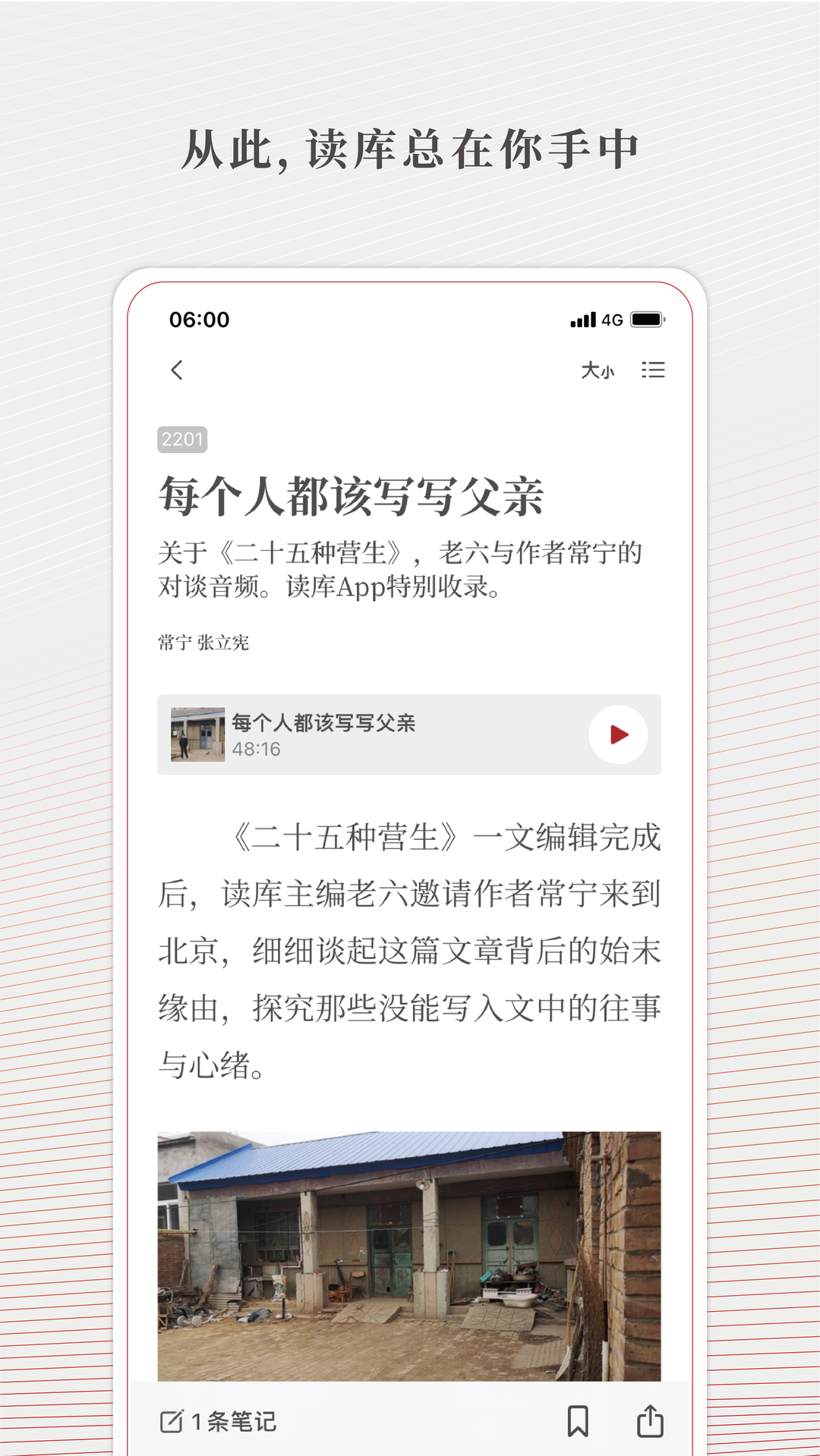 主编老六近乎偏执的“三有三不”原则——“有趣、有料、有种”“不遗余力、不计成本、不留遗憾”“成本没有上限,时间没有下限”,也让《读库》走过十六年,成为出版界的奇迹。当人们大谈区块链与货币,读库在关心时代里微不足道的小人物。「我爹这一辈子,大概干过二十五种专业或职业,从种菜开始,以清洁工结束。」「我熟练地开车前行,像轻轻摇动一艘悠然的船,摆渡着这个城市与我有缘的乘客。」当人们追求15分钟速听一本名著,读库愿意花150页的篇幅,将文学家与他故乡之间的深刻「纠缠」,慢慢道来。「这地方有母亲生你时流出的血,这地方埋葬着你的祖先,这地方是你的『血地』。」「我的文学、我的笔和我的脚,都是有根的。连我走路的声音,都是有根的。」微博上,随处可见对《读库》滔滔不绝的「自来水安利」。订阅读库,是全家人定制的一整套充满「仪式感」的精神盛筵。纪实、历史、电影、音乐、美术、社科、经济、宇宙、科技,无所不包。不断为全家人解锁新认知,满足大人与孩子的各式好奇心。每两个月出版一册,全年7册,每册5-10篇非虚构文章,每篇5000-50000字,用写一本书的力气,记录这个时代的人与事。是阅读快感和思想深度的极致融合。一个好消息:现在下单,你将免费获得读库App一年会员资格!也就是说,你不仅能收到读库全年纸质书,还可通过App读到2023每一期《读库》的内容。甚至,往期《读库》内容也会陆续录入App。就像一些朋友所期待的:打开App,十几年《读库》内容一览无余!这还不止,通过App,原本你只能在纸上读到的访谈、沙龙,现在甚至可以听到现场原声、看到视频实录。