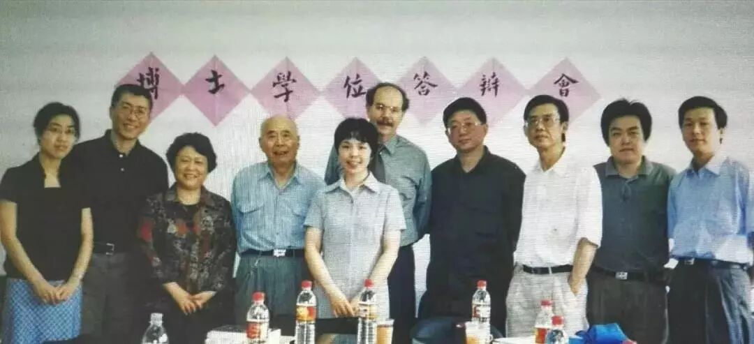 2001年6月,张炼红博士论文答辩会,左起:周春玲、王晓明、王文英、钱谷融、张炼红、胡志德、陈思和、蔡翔、胡晓明、谭帆。