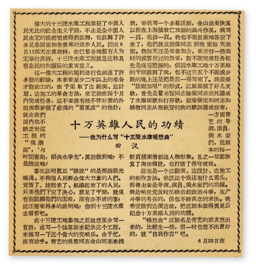 田汉,“十万英雄人民的功绩——我为什么写‘十三陵水库畅想曲’”,《人民日报》,1958.7.6