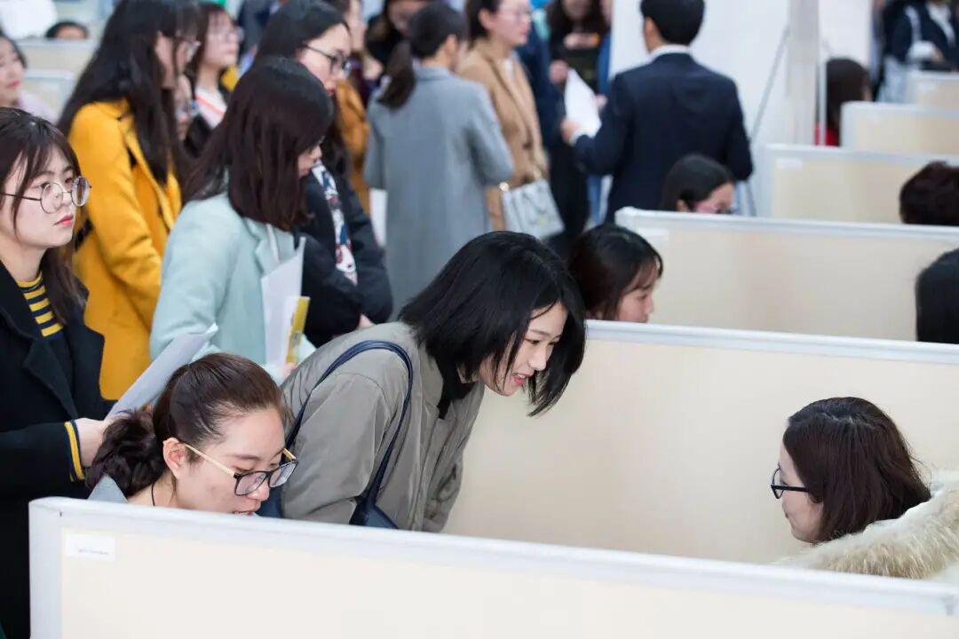 2017年,江苏省南京市的女大学生专场招聘,毕业生与用人单位洽谈。