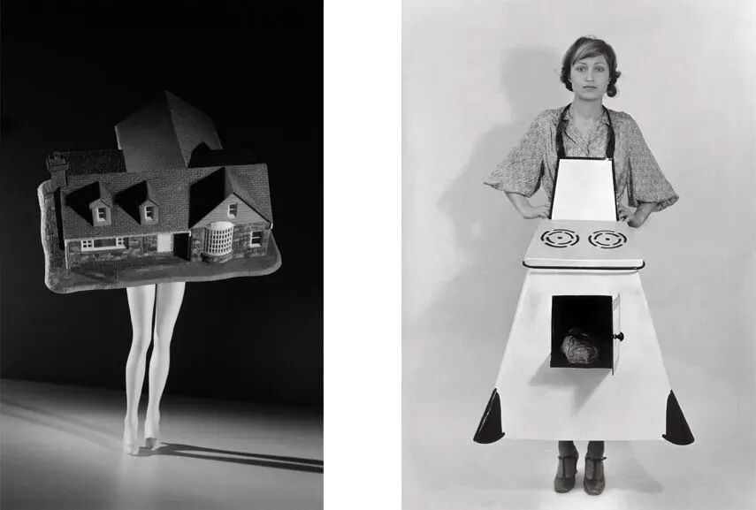 左:劳里·西蒙斯(Laurie Simmons)《腿上的物体》(Objects on Legs,1974);右:比吉特·尤尔根森(Birgit Jürgenssen)《家庭主妇厨房围裙(Hausfrauen-Küchenschürze,1975)