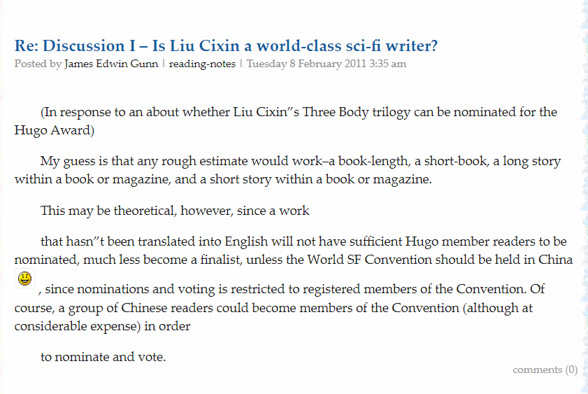 这一年年末,中国科幻界翘首以待的《死神永生》问世,并在一些热心的媒体人士推动下,迅速出圈,掀起了超出所有人预想的“三体”旋风。研究坊也与时俱进地展开讨论:刘慈欣是否已经企及,或如坊间所言,将中国科幻提升到了世界级的水准?在作品畅销之外,世界级科幻作家还应具备何种品质?其他中国科幻作家能否与之并驾齐驱?非英语科幻作家如何赢得世界声誉?以及,刘慈欣是否有机会获得雨果奖?……冈恩教授强调说,《三体》要得奖,需要先翻译成英文呀,要不就得把世界科幻大会放中国开,或者中国读者组团参会。再次出乎所有人预料,这种在半开玩笑的研讨中出现的“what if”,数年后就经由刘宇昆的精妙译笔成为现实。