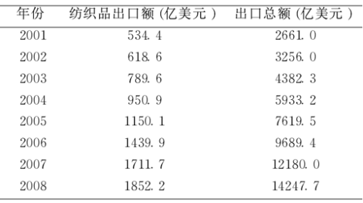 2001-2008年中国纺织品出口额与出口总额