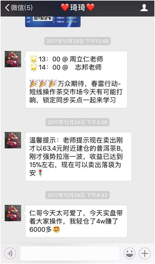 一天老师正在上课,突然弹出一个QQ窗口抖动,是老师的一个朋友,格力的工程师李工,李工赚了30%,两天赚几十万,问老师怎么操作?顿时评论里一片沸腾,老师,什么东西这么赚钱,带带我们?一开始老师还藏着掖着,不愿意说,评论里不屈不饶继续追问,差不多一两个小时以后才告诉大家,是炒茶交所的茶叶,老师本人也在炒,这几天赚了几十万。