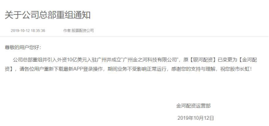 更多的是假冒券商名义开展非法证券活动的,如金河配资,此前叫银河配资,就是假冒银河证券的名义开发展非法证券活动。今年10月12日,该公司发布“关于公司总部重组通知”, 声称公司总部重组并引入外资10亿美元入驻广州并成立“广州金之河科技有限公司”,原【银河配资】已变更为【金河配资】。