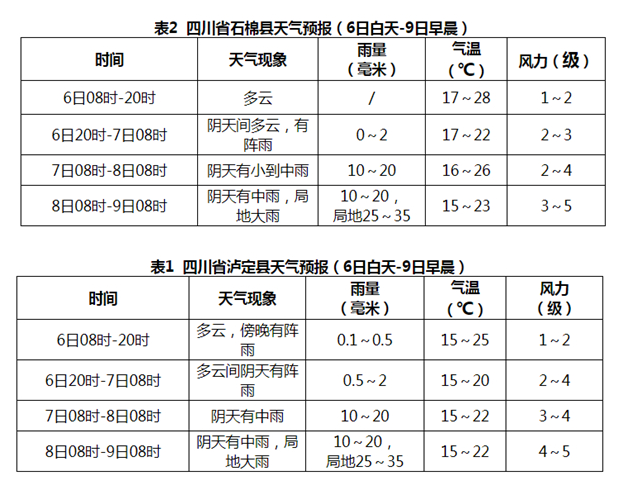 据中央气象台消息,9月5日,四川甘孜州泸定县和雅安市石棉县出现小雨。6日8时,泸定县气温15℃,石棉县17℃。预计,6日泸定县和石棉县阴天间多云有阵雨;7日至8日有明显降雨过程,雨量以中雨为主,局地大雨,具体预报见附表。