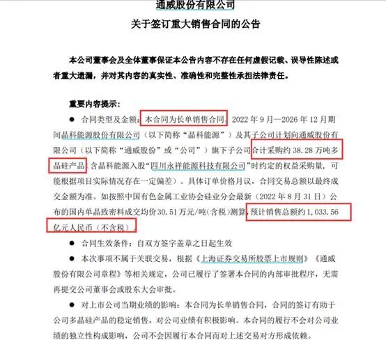 这是A股上市公司通威股份(600438.SH)最新签订的千亿销售合同,金额之大在该公司历史上罕见,在A股市场历史上也极为少见。