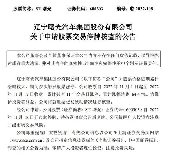 11月17日晚,ST曙光发布公告宣布,公司股票自2022年11月18日开市起停牌,待披露核查公告后复牌。
