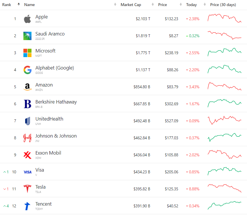 特斯拉今年跌幅已超过64%,股价创2020年9月份以来新低。全球上市公司市值排行网CompaniesMarketCap(公司市值)数据显示,特斯拉总市值已经跌破4000亿美元,退出全球上市公司市值前10名,仅高于腾讯控股。