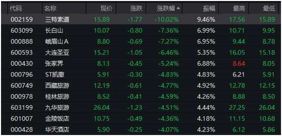 旅游餐饮、酿酒、食品饮料等消费板块今日集体回落,截至收盘,旅游餐饮板块方面,三特索道跌停,长白山、峨眉山A跌超7%,张家界跌超5%,华天酒店、金陵饭店跌超4%。