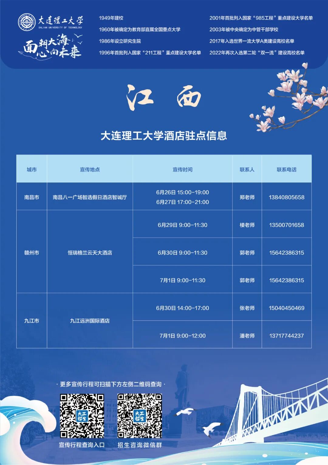 各位同学, 你是否苦恼找不到专业的老师咨询大连理工大学的报考政策?是否苦恼中学不召开宣讲会?是否苦恼电话咨询没有面对面咨询更透彻?没关系,大连理工大学都给你准备好了!我们在全国部分省市安排了驻点酒店和专场咨询会,考生和家长可在规定时间范围内直接到现场咨询我校的老师,快来看看吧!