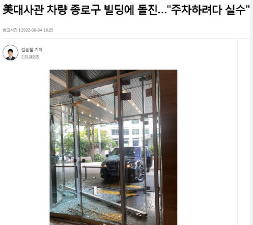 当地时间8月4日下午,美国驻韩大使馆一车辆发生车祸,撞向韩国首尔钟路区寿松洞一处大楼。事故造成玻璃门破损,无人员受伤。