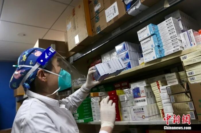 资料图:医务人员正将配送到的感冒药放入药架。中新社记者 易海菲 摄