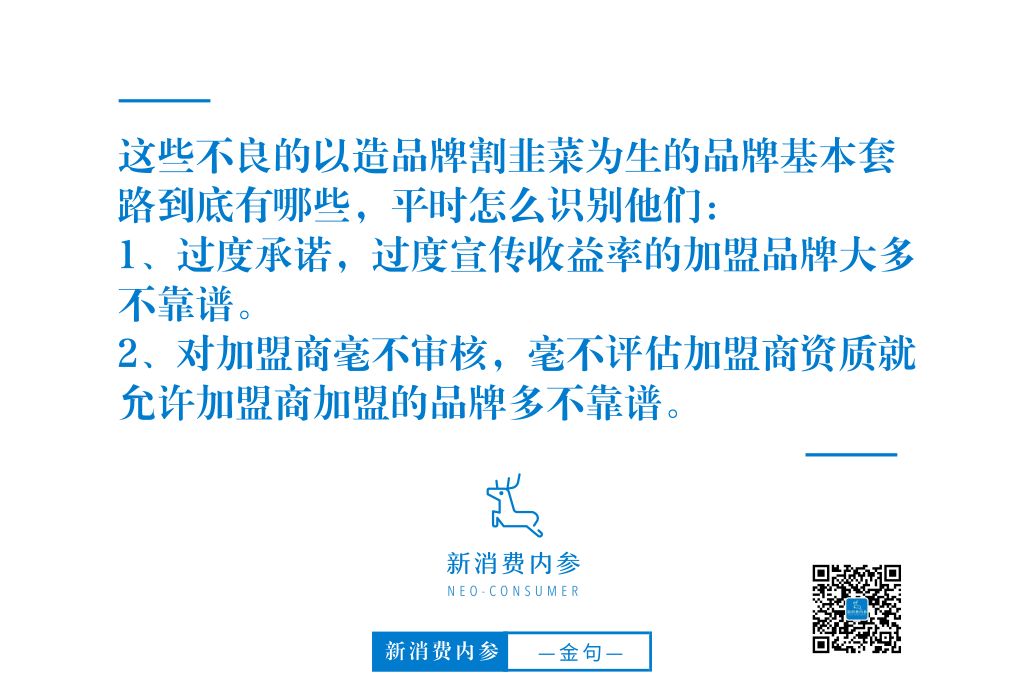 首先,最基础的加盟费赚一次。这是大头中的大头部分。我曾经认识一个成都著名的火锅店老板,他们的收费套路是这个样子的,他们首先是要做一个品牌定位,然后从第一天开始就宣称已经有n家的加盟店。然后下一步就是需要让加盟商相信自己生意的火爆性,所以这个时候美团这样的团购营销工具就有用了,比如制定一个99元的套餐,原来价格499,这样一般每天都会有大量的人来预约了,这样会造成火爆的价格,而提前沟通好的加盟商就会来实地观察生意是否火爆,从而顺利吸引加盟商的加盟。对于很多加盟商而言,无法识别出某个生意是否好坏是加盟商被割的根本逻辑,在这个套路里,加盟商就是只靠单纯的加盟对象生意火爆来判定,就很容易成为韭菜,而不良品牌,正好磨刀霍霍向韭菜。如果这个品牌要是经营一段时间以后倒闭了,一般品牌会有好几个品牌,所以这个时候会推荐再加盟其另外一个品牌。我认识的这家餐饮就是原品牌被过度透支加盟以后,很快就重新升级了一个全新的品牌,这些加盟商就很快又被透支一次。第二:赚取供应链的钱。长线做加盟的品牌和短线做品牌的差异就在于,最终赚的是供应链的钱,还是赚一波品牌的钱。对于认真做加盟,不是割一波韭菜就走的品牌而言,他显然是要赚供应链钱的,最好是免加盟费,主要是靠管理获得收益而不是加盟费作为核心收益。我们知道很多做小吃餐饮的店铺都在地下餐饮街,这些商业地产长期和这些职业放加盟的和快招公司之间有说不清楚的利益。对于很多加盟商而言,每一次获得一个加盟权开店以后,曾经品牌商承诺的各种资源支持就不见影子了。而负责租位置的地产商,在一波又一波用户流动中赚的盆满钵满。所以,我小小总结下,这些不良的以造品牌割韭菜为生的品牌基本套路到底有哪些,平时怎么识别他们:1、过度承诺,过度宣传收益率的加盟品牌大多不靠谱。比如很多做奶茶的加盟商,很多时候都会拿喜茶火爆作为例子来去骗加盟商。他们往往会夸大宣传,制造虚假火爆的假象。比如把促销价格造成的火爆和黄牛催生的火爆让加盟商误以为是生意的火爆,同时从收益率角度给你不实际和过度承诺的基本都不会赚到钱。你只需要想到一个逻辑,如果一个品牌自己直营生意火爆,能赚很多钱,他们往往是不愿意开放加盟的,人性贪婪如此,但是后面我会解释为什么有一波认真做品牌的对象,为什么有时候又需要自己的加盟商。![]()