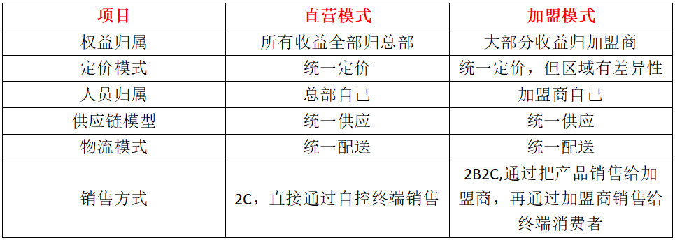 我写文章从来不只是破坏,而更看重建设,加盟作为全世界已经验证成熟的商业模式,一定是有其存在道理的,下面我先通过一张表格来说明直营和加盟的模式不同,来说明为什么很多世界上优秀的如星巴克、肯德基、711这些公司都要依靠加盟来在全世界扩张,而本土瑞幸咖啡推出的小鹿茶,以及绝味鸭脖为什么都要开始推加盟模型。通过上面的图片,我们可以清晰地发现直营模式和加盟商模型在商业模型设计上是完全不同的,所以我们明显发现直营和加盟两种模型不同的优劣:对终端定价、服务质量、标准化程度管控更加严格,从而做到服务的统一性。品牌直营的根本目的在于统一的服务体系,赚取品牌成长和管理的溢价。所以我们会发现一个有意思的问题,海底捞是不会放加盟的。喜茶也不会放加盟的。对于这些公司最终利润并不单纯靠产品溢价,而是靠服务形成的品牌溢价赚钱。这类产品都是典型具备强大社交货币属性的产品,他们背后承载的高品牌溢价必须通过统一的服务,品牌识别来交付。尤其明显的是海底捞,如果让加盟商自己去经营,人员激励就会变得异常难做。因为这套人力资源体系,只有总部才能培养出来,也只有总部才会培养。对于主要以赚钱作为使命的加盟商而言,是不会大力气做自己的人力资源体系的。有能力做人力资源体系和服务的品牌,就已经自己长成了巴奴这样的品牌。但是直营模式不是就说非常完美,因为直营模式有一个最为致命的问题,如何做好区域扩张激励,同时对于有些生意而言,人员成本过高和区域扩张速度过慢,在某些特定区域需要有本地资源和经营积极性的加盟商来完成渠道扩张。区域主观能动性会非常积极,因为做的是自己的生意,在激励生产模型上非常先进。这些都是一般品牌进入到区域扩张的时候问题,另外品牌商也不需要密集的资金才能实现扩张。但是加盟商也有自己的不足,自己不具备产品制造能力,自己没有很好地商业素养,所以这就需要可以加盟的产品,在品牌经营上有足够的推广能力,同时在终端的产品形态比较标准化和单一。这就是绝味鸭脖这样的公司为什么可以快速通过加盟商体系扩张的原因,因为产品非常标准,我也来介绍一下什么样的产品形态适合进行加盟,加盟商存活率更高:广谱性也就是所谓的大众性,你的产品无论是以甜为核心的食物产区,还是以辣为特色的川湘区,大家都统统接受产品品类,不会有人会觉得这是我不爱吃的品类。从这个特点来看,如果不是无良商家的坑害,像茶这样的品类是具有非常好的加盟优势的,只是由于出现过度山寨商家,无良商家,导致茶行业没有品牌背书的品牌的加盟价值变得比较低,不然茶依然是非常好的加盟品类,因为用户教育成本价低,瑞幸小鹿茶这样值得加盟的知名品牌并不多见。2、必须是能够成瘾以及高频消费的产品,最好有比较多元的消费场景的覆盖。目前显性可以成瘾就是烟酒茶,其实辣也可以成瘾,比如绝味鸭脖适合加盟是因为鸭脖子食材获得的广谱性。![]()