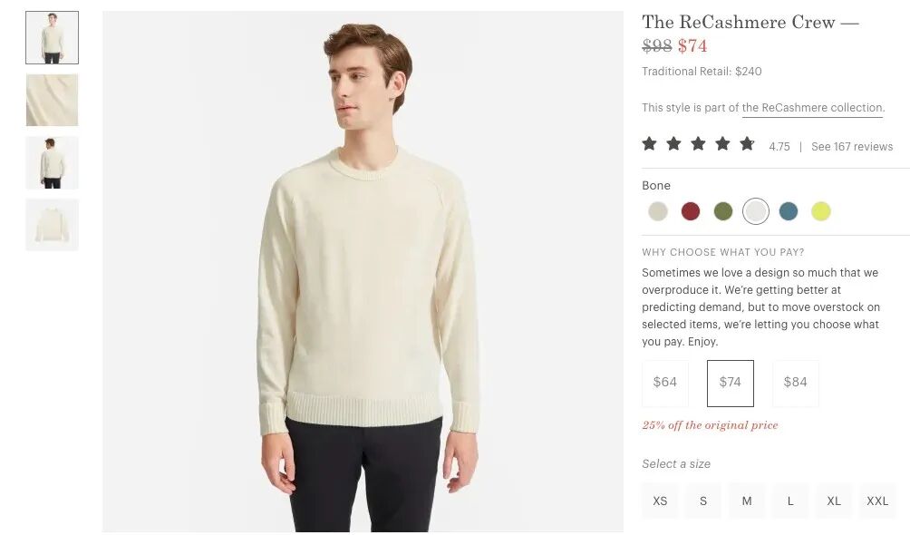 在DTC 品牌构建中,最后一个关键的因素就是将品牌所传递核心价值理念体现在品牌的经营活动中。例如,Everlane通过ChooseWhatYouPay 促销活动,进一步强化了品牌Pricing Transparency 的核心理念。通过对同一件商品为消费者提供三个不同的价格选择,并且标明每个价格所包含的用途。以一件64美元的开司米毛衣为例,64美元的基础价格包含了产品开发,制造和物流成本。在第二档74美元的定价中,有10美元将会用于覆盖公司的管理成本。如果消费者选择支付84美元,加价的10美元将会被用于投资到产品未来的研发中。在Everlane2015年的首次ChooseWhatYouPay 促销活动中,约有10%的消费者选择支付溢价。创始人 Michael Preysman 用”It’s the affinity”来解释消费者选择支付溢价的原因,他说:"If you're honest and transparent with people, then they'll sort of treat you with decency in return"。