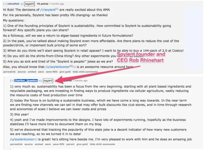 与传统零售品牌相比,在早期,DTC的品牌价值观更接近于一种Ideology,创始人扮演着布道者和社区精神领袖的角色。这一特质在很多成功DTC品牌早期都有所体现,其中最典型的要数代餐品牌Soylent。在品牌创立前,创始人RobRhinehart不仅通过在自己的博客和在Rebbit分享代餐食谱,计量和配方改进,传播自身的科学和可持续营养理念,同时,也激励社区成员在Rebbit上分享自己的代餐食用经验和自创食谱,从而在品牌创立之前,就形成了一个紧密的early adopter社区。Soylent的早期投资人Chris Dixon就表示Soylent并不是仅仅是一个食品公司,更是一个致力于科学提高营养水平代餐爱好者的社区。正如他所说:” Soylent is a community of people who are enthusiastic about using science to improve food and nutrition. The company makes money selling one version of that improved food(some users buy ‘official Soylent,’ others buy ingredients to make their own DIY Soylent recipe). If you look at Soylent as just a food company, you misjudge the core of the company, the sameway you would if you looked at GoPro as just a camera company”。这种用于维系社区精神的交流与体验氛围,在品牌逐渐成长的过程中仍然扮演重要角色。Rob Rhinehart 本人Soylent 团队仍然定期在Rebbit 更新,同时Rob Rhinehart 通过 AMAs (Ask Me Anytings)直接回答Rebbit 成员关于代餐和品牌的疑问。同时,通过引入开源产品的概念,Soylent 鼓励每个消费者创造自己版本的 Soylent 食谱,将消费者正真纳入了产品的开发。
