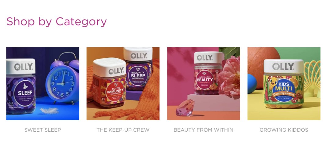 目前Olly共有35款产品,主要解决的健康保健的问题-免疫力、睡眠、压力、头发与皮肤护理、每日身体所需能量。当产品线越来越多的时候,Olly运用差异法区分相似产品,避免相互之间销量抵充。