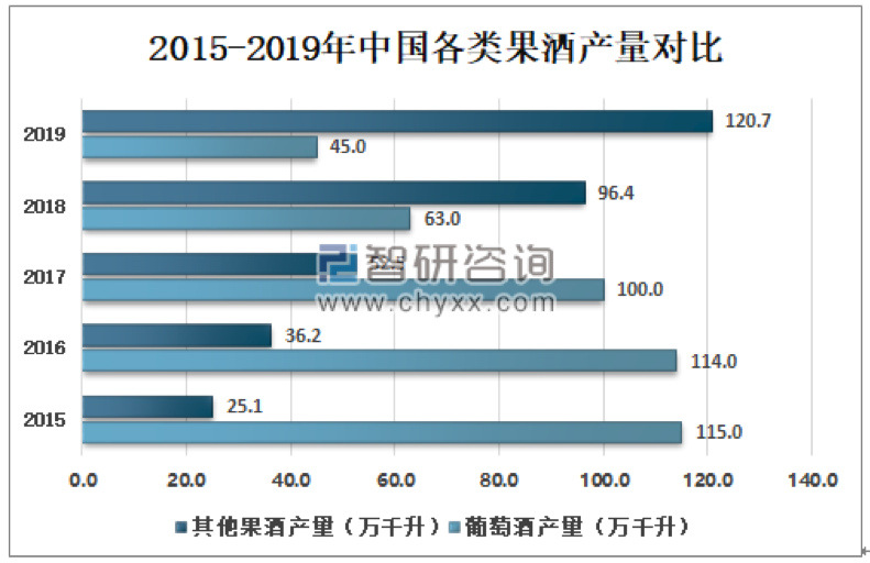 于是在这样的背景下果酒迎来了它的春天,在2013年中国果酒的市场规模已经达到120亿元,在果酒的总市场(包括葡萄酒的大品类市场)中占据10%的比例,到2019年果酒大品类市场的总规模已经突破2000亿元,其中还呈现出此消彼长的势头。从2015年到2019年,葡萄酒的产量与其在总产量中的比重正逐渐降低,其他品类果酒呈现出稳定上升的态势。