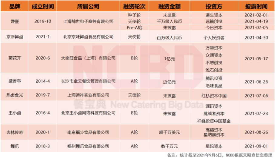 卤味属于一种熟食,这个行业虽然较为分散,集中度不高,但这个市场的规模相比一些当下比较火的赛道来说更大。在这个行业里,通常能够看到的经营形式多以个体经营为主,门店多开在路边街头、农贸市场、超市里,业态规模小。但这个市场的规模并不小,并且在过去十年里持续快速增长。根据艾媒数据中心的一份研究报告显示,从2011年到2020年,中国卤制品行业市场规模从268亿元增长到了1235亿元。2015年之后每年的增幅都在百亿元左右,在2019年正式突破千亿。是休闲食品中增速最快的品类。而包括佐餐卤制品和休闲卤制品在内的整个卤味市场规模据CBNData的报告显示,已经突破3000亿元,年复合增长率达20%。这背后显然是我国食品工业技术的快速成熟,推动了标准化生产和品牌连锁化经营。并且至今在卤味赛道里已经有三家上市公司,分别是煌上煌、周黑鸭和绝味食品。近期,又有一家卤味企业——紫燕百味鸡提交了招股书,拟在沪市主板上市。而另一边,今年资本对于卤味赛道的热度也丝毫不弱于其它任何一个其它行业的赛道。进入2021年以来,卤味赛道内已经有多家品牌进行了融资。根据NCBD(餐宝典)发布的《 2021年中国卤味熟食行业发展研究报告》的不完全统计,2021年以来,截至9月1日,至少有8个卤味品牌完成了总计10轮融资。其中,刚刚进行天使轮融资的就有3家,2家进入B轮融资,3家完成A轮,其中不乏近年来最为红火的品牌,如王小卤。而已披露融资金额的就有1家融资1亿元,还有一家接近亿元。同时还可以看到,这些融资的品牌中,大多为最近3年成立的,有3家更是在最近1年内成立。再看参与投资的资方,红杉资本中国、源码资本、挑战者资本、高榕资本、今日资本、祥峰投资中国基金、腾讯投资等等,行业内能叫得上名字的、排得上号的投资机构几乎都到齐了。其实卤味并不是什么新的消费物种,卤味品牌的市场争夺已经延续多年,如周黑鸭、绝味食品的线下竞赛。但其实难说究竟是这个赛道吸引了资本,还是卤味市场再次被资本催热。因为卤味食品作为我们国人的一种传统菜肴有稳定且广泛的消费人群,现有的三大巨头煌上煌、绝味和周黑鸭已经盘踞市场多年,但市场机会还很多。一方面,因为卤味食品在品类上还有很大的操作空间,品牌集中度较低,像鲜卤、零食、预制卤味等品类都还没有出现头部品牌,越来越多新入的品牌都在寻找不同的产品切入点,整个市场的品牌多元化越来越明显。另一方面,在泛餐饮、食品的大行业中,卤味赛道是公司成功上市最多的,并且即便是在餐饮行业受疫情影响严重的2020年,卤味品牌的营收能力依然保持稳定,足以说明这条赛道内的基本运营模式是经过市场验证过的。所以不能简单地去说究竟是市场吸引了资本,还是资本催热了这条赛道。他们之间是相互作用的结果,卤味市场蕴含的机会吸引了正在寻求有增长潜力的赛道和优质项目的资本,资本的进入使得原本就很有热度的市场进一步升温。![]()