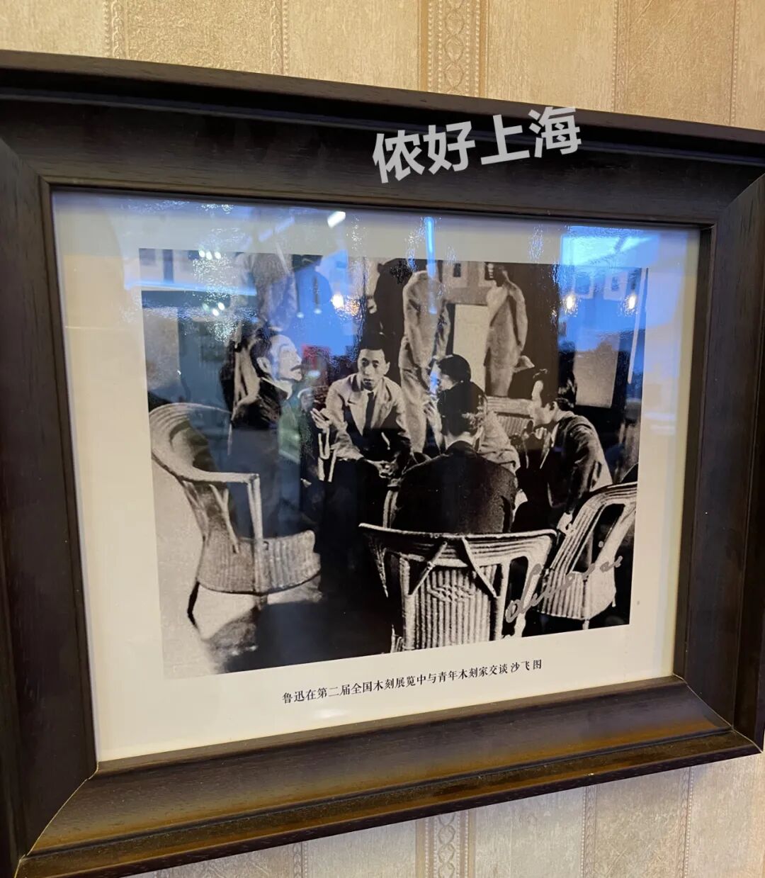 历史照片包括1939年的白马咖啡馆、被称为中国左翼作家联盟诞生摇篮的公啡咖啡馆以及1936年鲁迅先生参加第二届全国木刻展览的场景等。