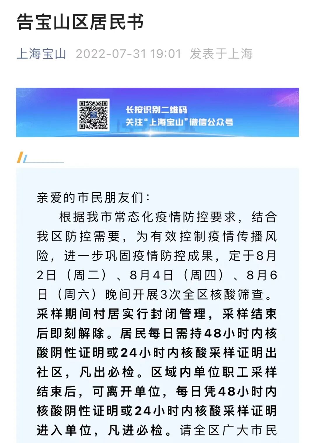 为持续巩固疫情防控成果,尽早发现和控制疫情风险,决定对静安区、普陀区、虹口区、杨浦区、宝山区全域和其余行政区有阳性感染者轨迹的街道(镇)开展全员核酸筛查。