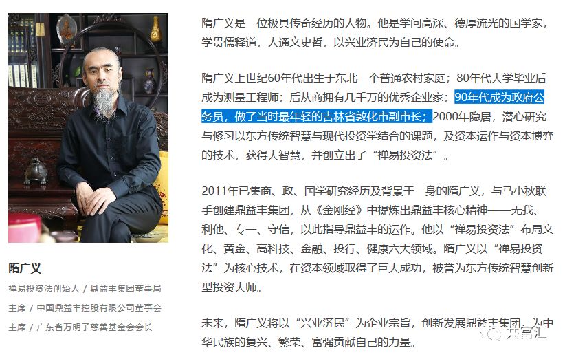 深圳鼎益丰的官网,对隋广义的传奇经历和鼎益丰的起源,是如此介绍的:隋广义上世纪60年代出生于东北一个普通农村家庭;80年代大学毕业后成为测量工程师;后从商拥有几千万的优秀企业家;90年代成为政府公务员,做了当时最年轻的吉林省敦化市副市长;2000年隐居,潜心研究与修习以东方传统智慧与现代投资学结合的课题,及资本运作与资本博弈的技术,获得大智慧,并创立出了“禅易投资法”;2011年已集商、政、国学研究经历及背景于一身的隋广义,与马小秋联手创建鼎益丰集团,以“禅易投资法”为核心技术,布局文化、黄金、高科技、金融、投行、健康六大领域,在资本领域取得了巨大成功。