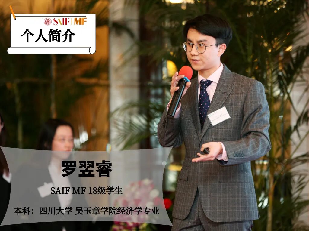 我叫罗翌睿Shawn,本科就读于四川大学吴玉章学院经济学专业,因为先后参与了两次国际青年领袖金融高峰会(IYLFS)而与SAIF结下不解之缘。而后,成功保研来高金就读,在这里认识了最有趣优秀的一群朋友,度过了最难忘的一段时光。现在获得了德勤摩立特(Monitor Deloitte)咨询公司的全职offer,准备毕业后在上海工作。