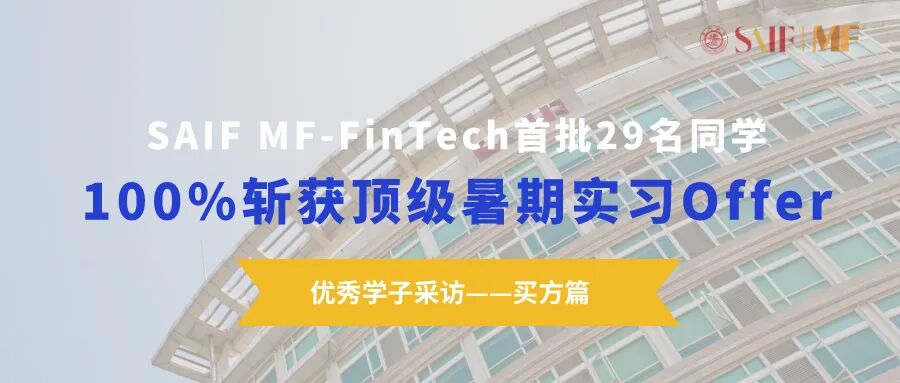 本期我们请到了上海交通大学上海高级金融学院(简称SAIF)金融硕士项目(简称MF)2019级FinTech Track的刘逊知与马海乾同学。作为SAIF MF FinTech Track首批学子,经过一年的学习,两位同学分别拿下多家大买方量化岗位Summer Intern Offer。下面一起听听他们的学习故事与求职心得吧。