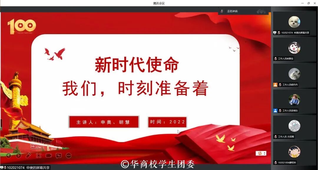 为深入学习贯彻习近平总书记在庆祝中国共产主义青年团成立 100 周年大会上的重要讲话精神,提高华商青年思想政治素质,践行“请党放心,强国有我”的青春誓言,发扬广大华商学子踔厉奋发、笃行不怠的精神,广州华商学院第十期“青马班”学习分享会于 2022 年 5 月 31 日 18:00 在腾讯会议线上开展。