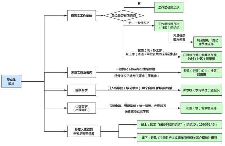 4、出国留学和出境学习的毕业生团员组织关系转接:可申请将团组织关系保留在原学校,提交保留组织关系的书面申请,且需要与学校负责组织建设的负责人建立联系。在国(境)外期间,应转入“出国留学(出境学习)团员团支部(组织ID:15598508)”集中管理,团员组织关系保留在学校的期限一般不超过5年。