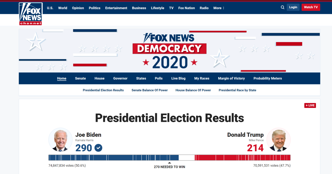 据福克斯新闻网的统计,美国民主党总统候选人拜登获得290张选举人票,共和党候选人、现任总统特朗普获得214张选举人票。而美国有线电视新闻网的统计则显示,拜登和特朗普目前分别获得选举人票279票和213票。