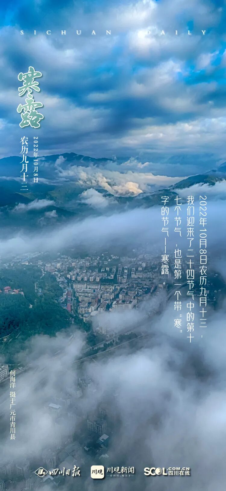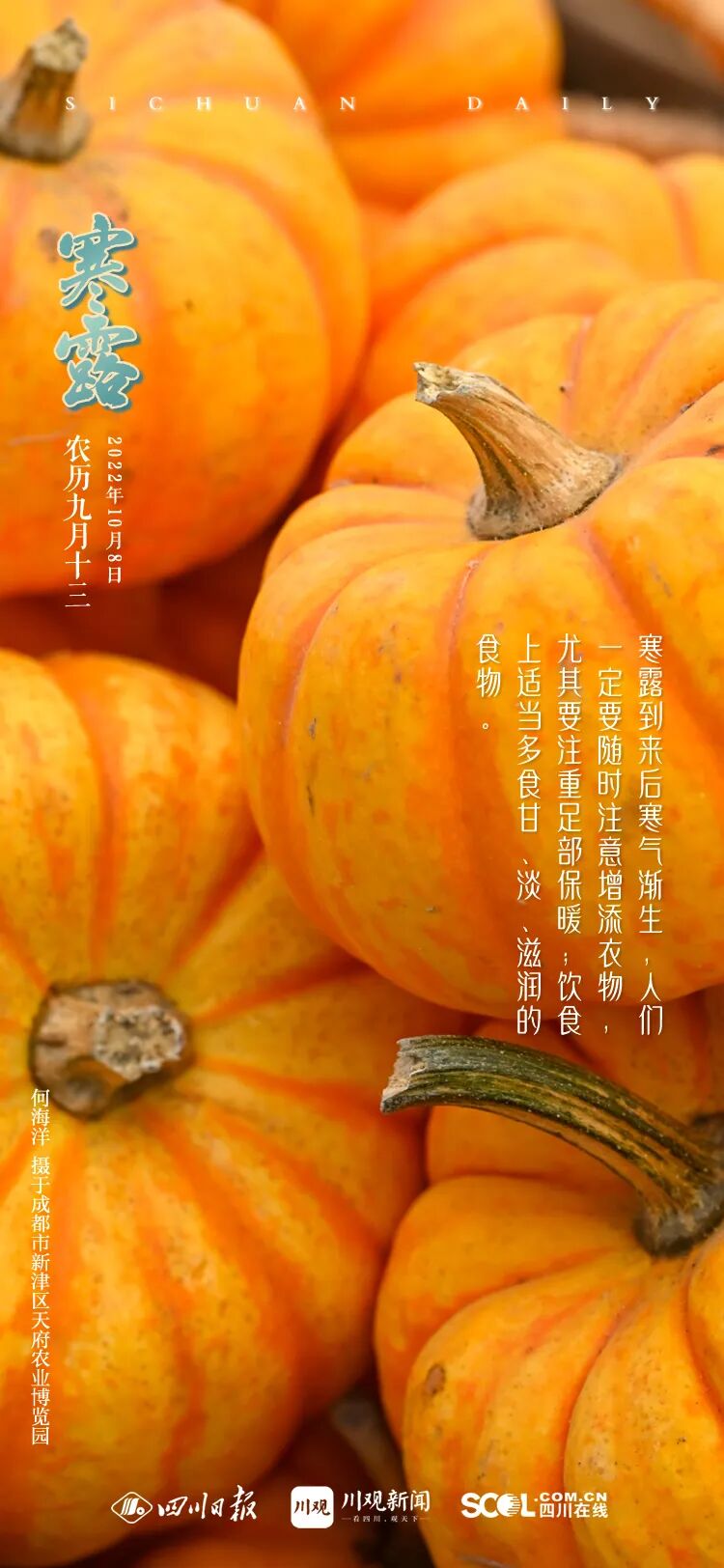 每年公历的10月7日、8日或9日,太阳到达黄经195度,为“寒露”节气开始。此时节,北半球阳光照射角度明显倾斜,地面接收的阳光热量显著减少,白天秋高气爽,夜晚冷若冰霜,因此“寒露”成为二十四节气中第一个带“寒”字的节气。