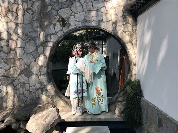 上昆青年演员罗晨雪、倪徐浩化身杜丽娘、柳梦梅,在江南庭院般的东安公园,唱出了“待无恙、多来往、共江南”的最美声音。