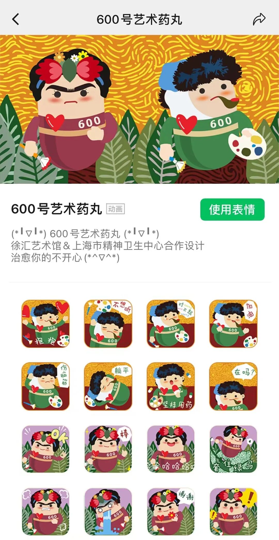 如今,徐汇艺术馆与上海市精神卫生中心一起头脑风暴,制作“600号艺术药丸”表情包,共同呼唤民众对于心理健康的持续关注。