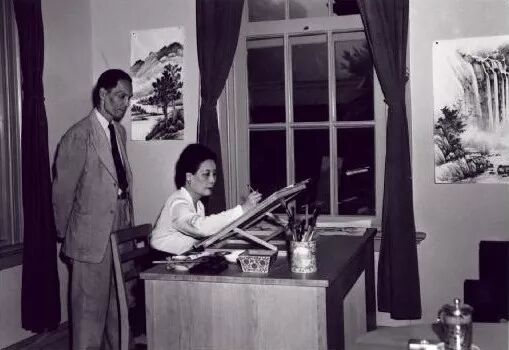 国画大师黄君璧(左)指导蒋宋美龄(右)作画