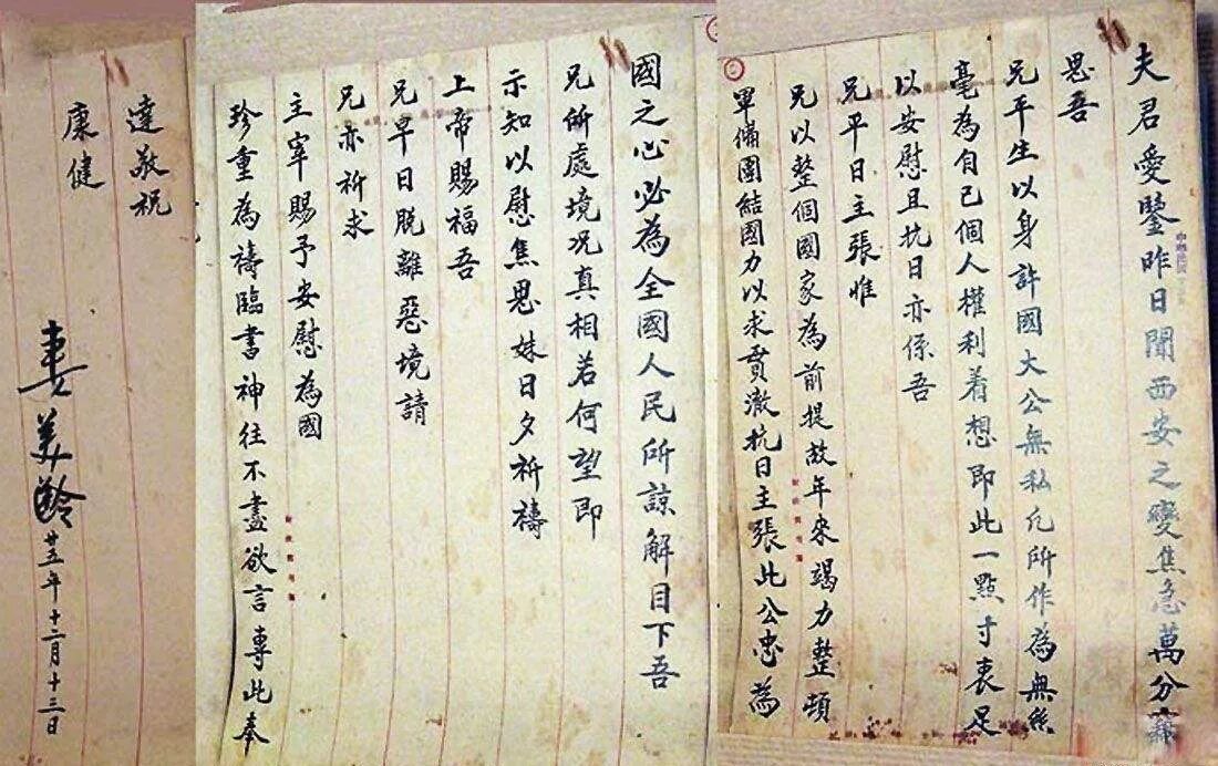 西安事变次日,宋美龄给蒋介石写信,要他“为国珍重”