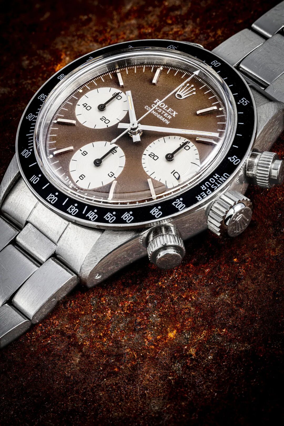 劳力士,不锈钢链带腕表,配计时功能及热带棕色表盘,“迪通拿”,型号6263,约1971年制。估价:港元 1,600,000 - 2,400,000