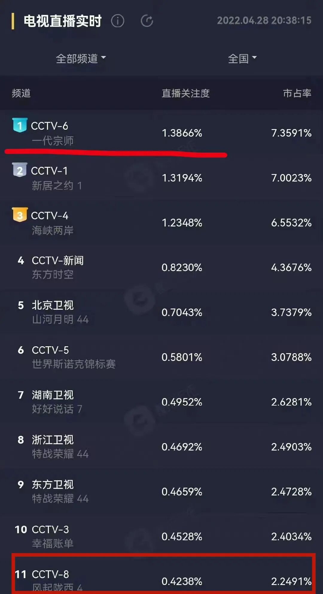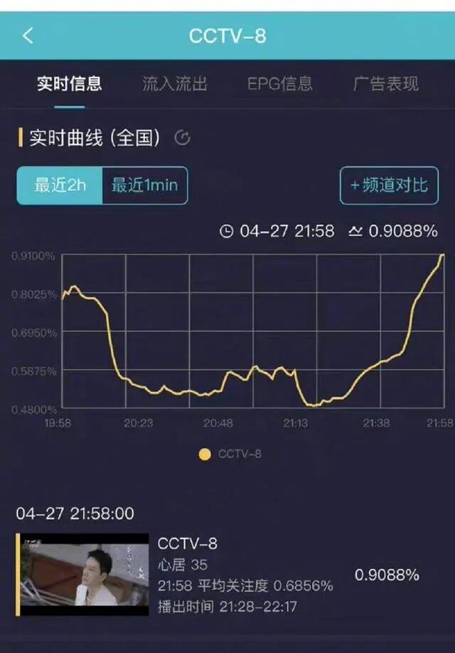 播出次日,实时收视率跌到谷底破了央八纪录,最低点还不如播广告热闹。同情央八的网友热热闹闹地把“央八”和“扑坤”一起送上了热搜。