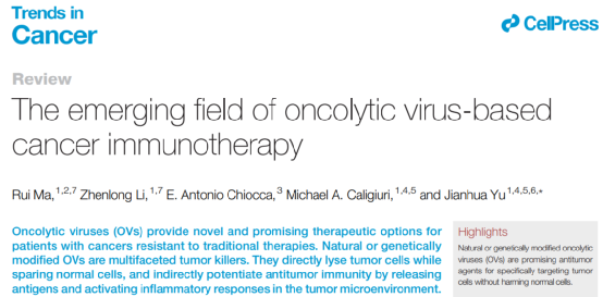 [1] Ma R, Li Z, Chiocca EA, Caligiuri MA, Yu J. The emerging field of oncolytic virus-based cancer immunotherapy. Trends Cancer. 2022 Nov 17:S2405-8033(22)00223-0. doi: 10.1016/j.trecan.2022.10.003. Epub ahead of print. PMID: 36402738.
