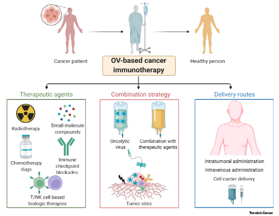 溶瘤病毒(OVs)为传统疗法耐药的癌症患者提供了新的和有前景的治疗选择。天然或基因修饰的OVs是多方面的肿瘤杀手。它们直接溶解肿瘤细胞,同时保留正常细胞,并通过释放抗原和激活肿瘤微环境中的炎症反应间接增强抗肿瘤免疫。然而,OVs对肿瘤的穿透性有限、持续时间短、宿主抗病毒免疫应答等局限性阻碍了溶瘤病毒疗法向临床的广泛转化。如果能够克服这些挑战,OVs +免疫检查点阻断(ICB)、嵌合抗原受体(CAR) T细胞或CAR自然杀伤(NK)细胞等联合疗法可能会为临床提供强大的治疗平台。
