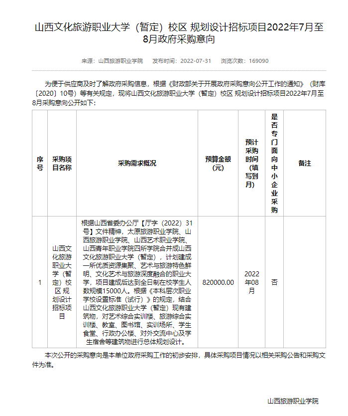 据山西省政府采购网显示,山西文化旅游职业大学(暂定)校区规划设计招标项目开始招标。内容提到,根据山西省委办公厅【厅字(2022)31号】文件精神,太原旅游职业学院、山西旅游职业学院、山西艺术职业学院、山西青年职业学院四所学院合并成山西文化旅游职业大学(暂定),计划建成一所优质资源集聚、艺术与旅游特色鲜明、文化艺术与旅游深度融合的职业大学,项目建成后达到全日制在校学生人数规模15000人。