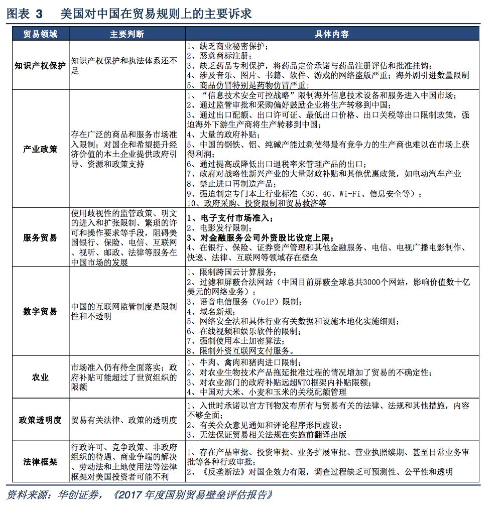 特朗普政府希望在中国寻求的“公平”贸易规则有哪些?既然特朗普挥动贸易大棒,是为后续的贸易规则谈判增加砝码,则了解特朗普政府对中国贸易规则的诉求是关键。2017年3月30日,美国贸易代表办公室(USTR)发布了《2017年度国别贸易壁垒评估报告》,详细阐述了包括中国在内的贸易伙伴存在的贸易壁垒情况,从知识产权保护、产业政策、服务贸易、数字贸易、农业、政策透明度、法律框架等7大类46小类对中国可能存在的贸易壁垒进行了梳理。其中,服务领域对电子支付、信用评级的市场准入和银行等股权投资比例,以及农业领域对牛肉进口的限制,均已经在此后的中美“百日计划”和特朗普访华后得以放开。而其他方面,例如对商业秘密等知识产权的保护、对国企等提供的信贷和政策支持等都是特朗普政府后续在中美贸易规则上的主要诉求。