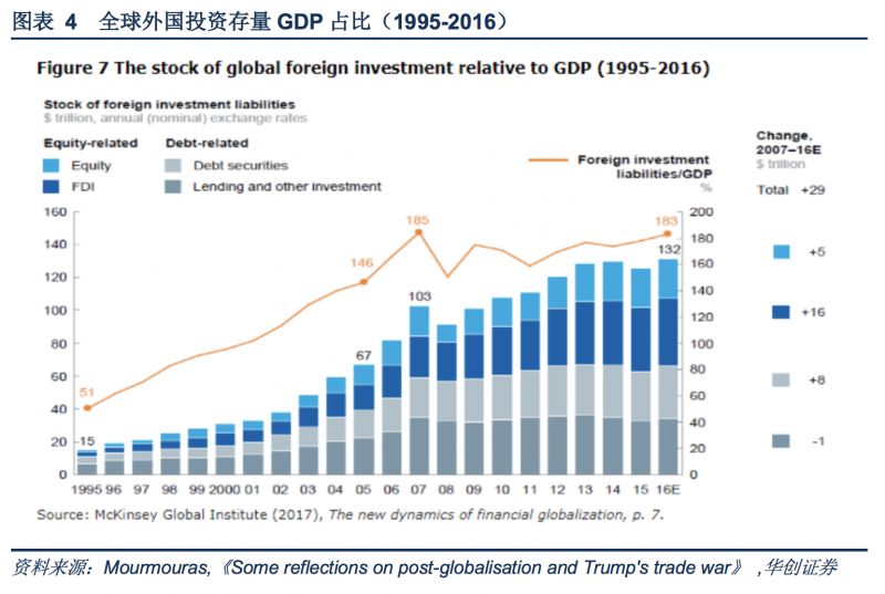 从存量外国直接投资相对于全球GDP的存量来看,全球化并没有停止。考虑到更稳定的外国直接投资在跨境资本流动中占比更高,金融全球化越来越稳定。全球金融危机后,外国投资负债占国内生产总值的比例仅略有下降,达到132万亿美元,占世界GDP的183%。
