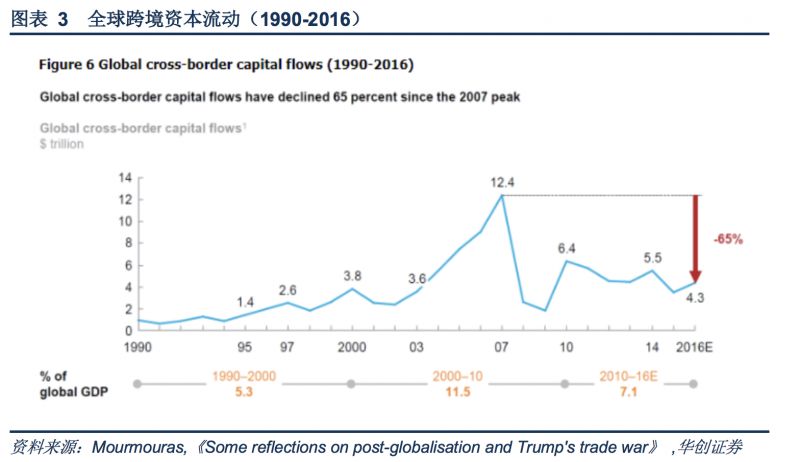 金融维度。为了充分了解全球化放缓的程度,还需要通过资本流动和外国直接投资等指标来观察,考虑金融的维度。跨境资本流动表明,今天的全球化正在倒退。金融危机爆发后,全球跨境资本流动一直呈现稳步下降趋势,至2016年其GDP占比只有4.3%。