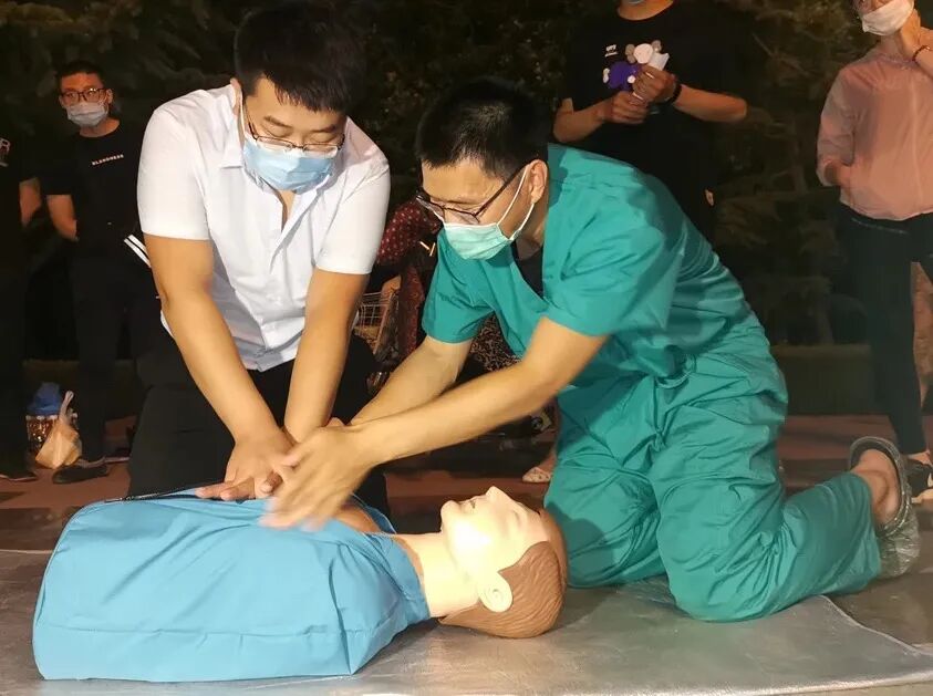 夜晚, 灯火阑珊的潍坊人民广场,经常在这里漫步的市民们没有像往常一样悠闲地欣赏夜景,却纷纷奔向一个路边“摊位”。只见“摊主”穿着绿色隔离衣,正跪在地上按压模拟人的心脏部位,一边有节奏地念着:“……1006、1007、1008,心跳呼吸停止,马上进行胸外按压……”