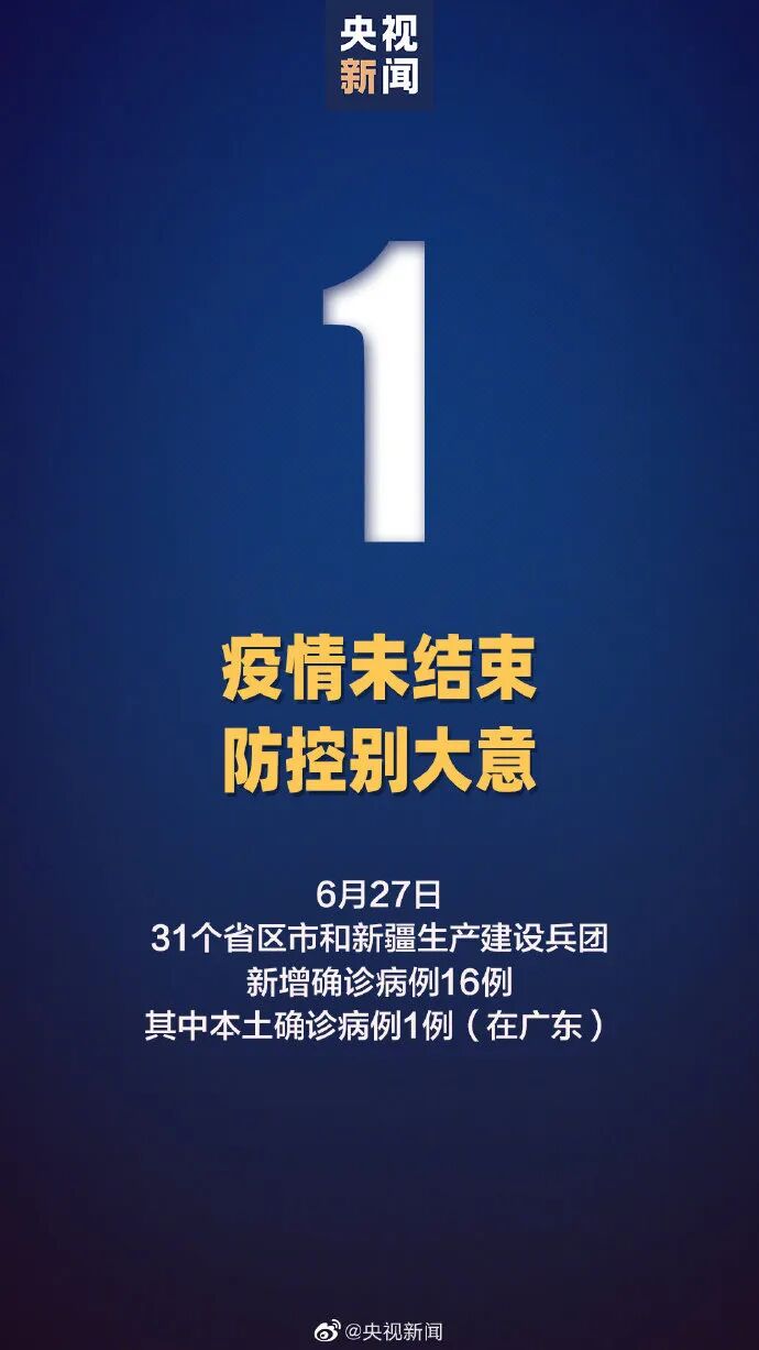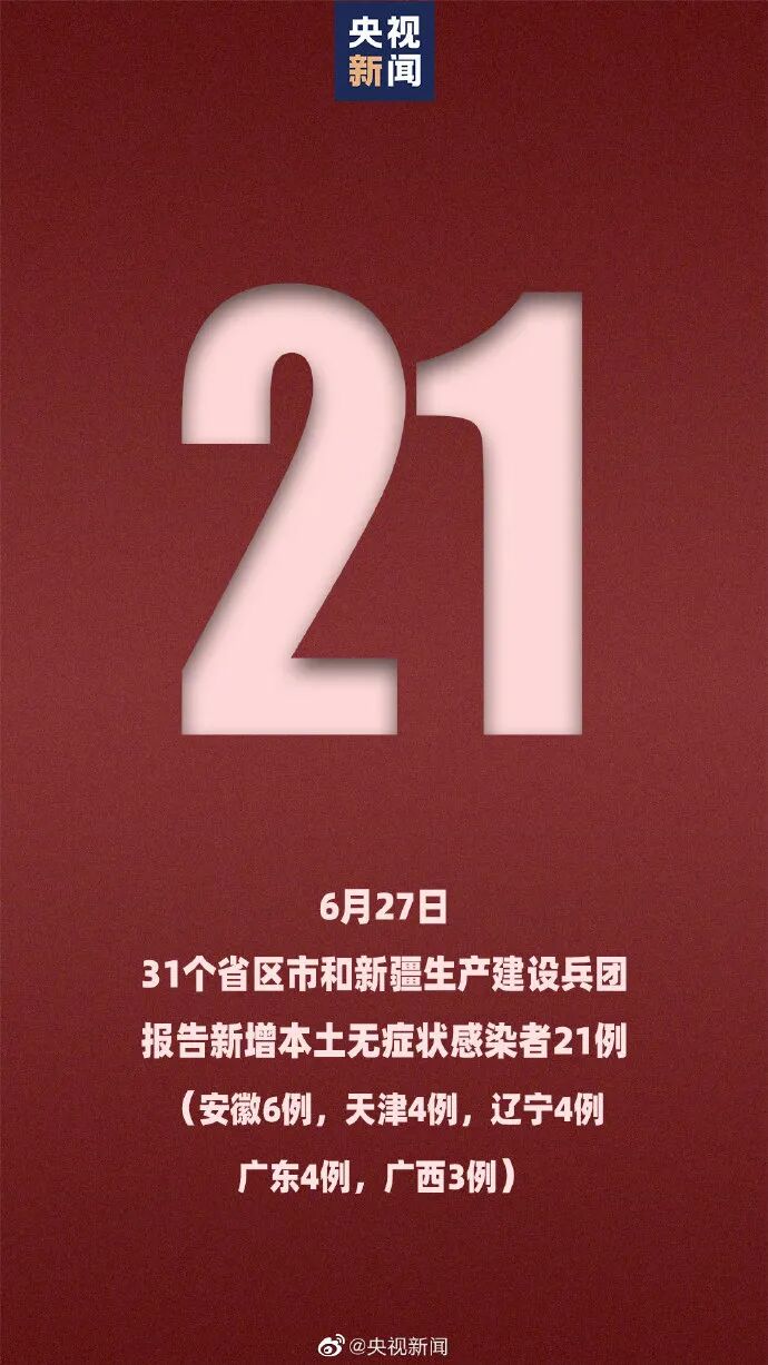 6月27日0—24时,31个省(自治区、直辖市)和新疆生产建设兵团报告新增确诊病例16例。其中境外输入病例15例,含2例由无症状感染者转为确诊病例;本土病例1例(在广东)。31个省(自治区、直辖市)和新疆生产建设兵团报告新增无症状感染者84例,其中境外输入63例,本土21例(安徽6例,天津4例,辽宁4例,广东4例,广西3例)![]()