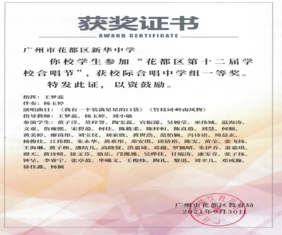 我校学生参加“花都区第十二届学校合唱节”,荣获校际合唱中学组一等奖
